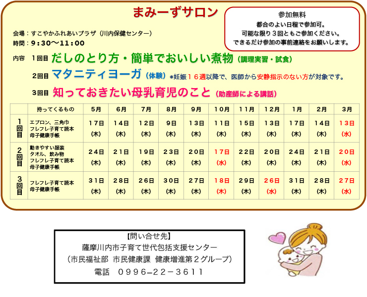 薩摩川内市では子育てサポートを目的とした「まみーずサロン」を下記の内容で開催します。