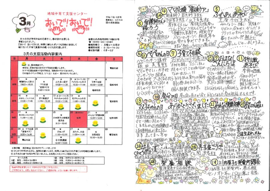 おいでおいで 3月号 記事公開日:2025年2月27日 前のページに戻る 今月のイベント << 11月 2025 >> 月火水木金土日 27 28 29 30 31 1 2 3 4 5 6 7 8 9 10 11 12 13 14 15 16 17 18 19 20 21 22 23 24 25 26 27 28 29 30 近日開催のイベント表示するイベントはありません。 最近の投稿 10月 母親教室を開催しました 10月 マタニティヨガ教室を開催しました(^◇^) 10月 2か月児相談会を開催しました 10月 プレパパママ教室を開催しました 10月 3か月児相談会を開催しました