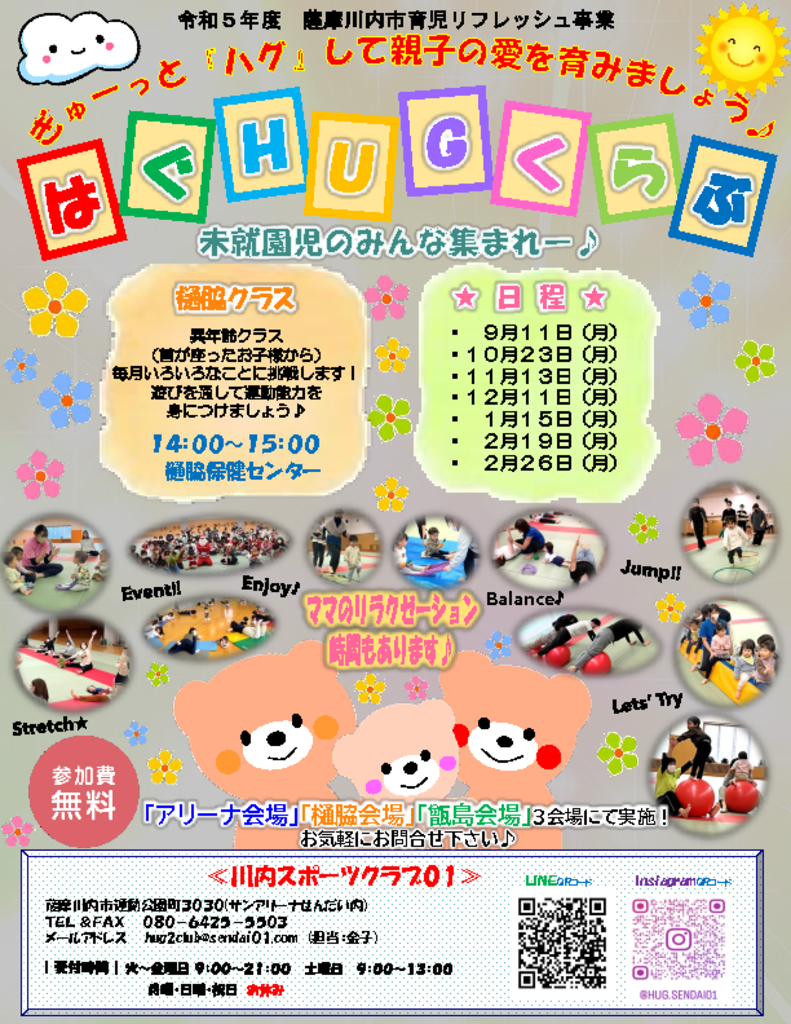 はぐHUGくらぶ樋脇ポスター 記事公開日:2024年2月14日 前のページに戻る 今月のイベント << 12月 2025 >> 月火水木金土日 1 2 3 4 5 6 7 8 9 10 11 12 13 14 15 16 17 18 19 20 21 22 23 24 25 26 27 28 29 30 31 1 2 3 4 近日開催のイベント表示するイベントはありません。 最近の投稿 11月 プレパパママ教室を開催しました 11月 3か月児相談会を開催しました 11月 2か月児相談会を開催しました 11月 母親教室を開催しました 11月 マタニティヨガ教室を開催しました(^◇^)
