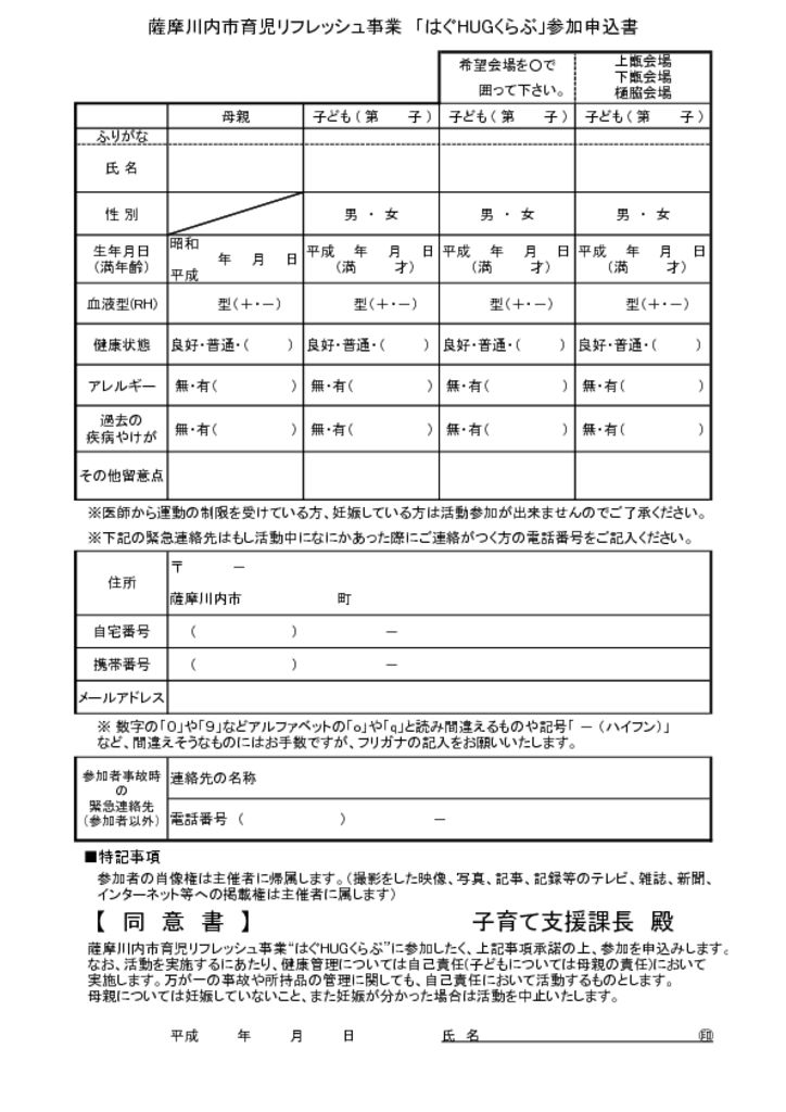 リフレッシュ事業参加申込書(樋脇・上甑・下甑クラス用) 記事公開日:2017年9月27日 / 最終更新日:2017年9月27日 リフレッシュ事業参加申込書(樋脇・上甑・下甑クラス用) 前のページに戻る 今月のイベント << 4月 2026 >> 月火水木金土日 30 31 1 2 3 4 5 6 7 8 9 10 11 12 13 14 15 16 17 18 19 20 21 22 23 24 25 26 27 28 29 30 1 2 3 近日開催のイベント表示するイベントはありません。 最近の投稿 2月 母親教室を開催しました 2月 3か月児相談会を開催しました 2月 2か月児相談会を開催しました 2月 プレパパママ教室を開催しました 2月 マタニティヨガ教室を開催しました(^◇^)
