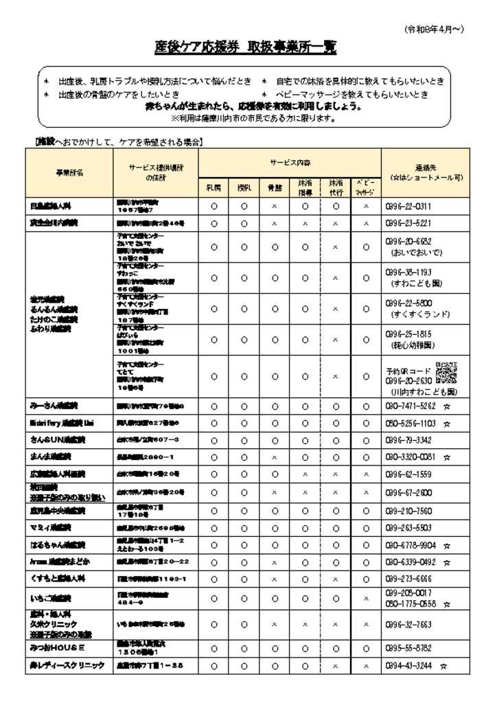 産後ケア応援券を利用できる事業所一覧